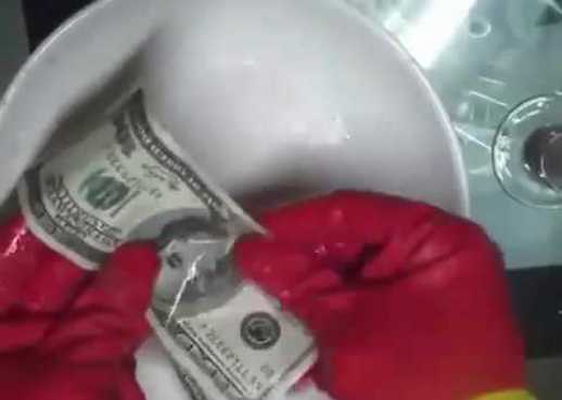 A Ghanaian native caught perpetrating the scam revealed to ABC News Chief Investigative Correspondent Brian Ross the tricks of the trade. Authentic hundred US dollar bills are coated with a protective layer of glue, and then dipped into a solution of tincture of iodine. The bill, when dried, looks and feels like black sugar paper. The mass of notes are real sugar paper; when the victim picks a “note” for cleaning, it is switched with the iodine coated note. The “magic cleaning solution” is actually crushed Vitamin C tablets dissolved in water. In another arrest, ordinary raspberry drink mix was found to be the “magic cleaning solution”. Now Ca(OH)2 and Mg(OH)2 are used and dissolve their note into these solutions.